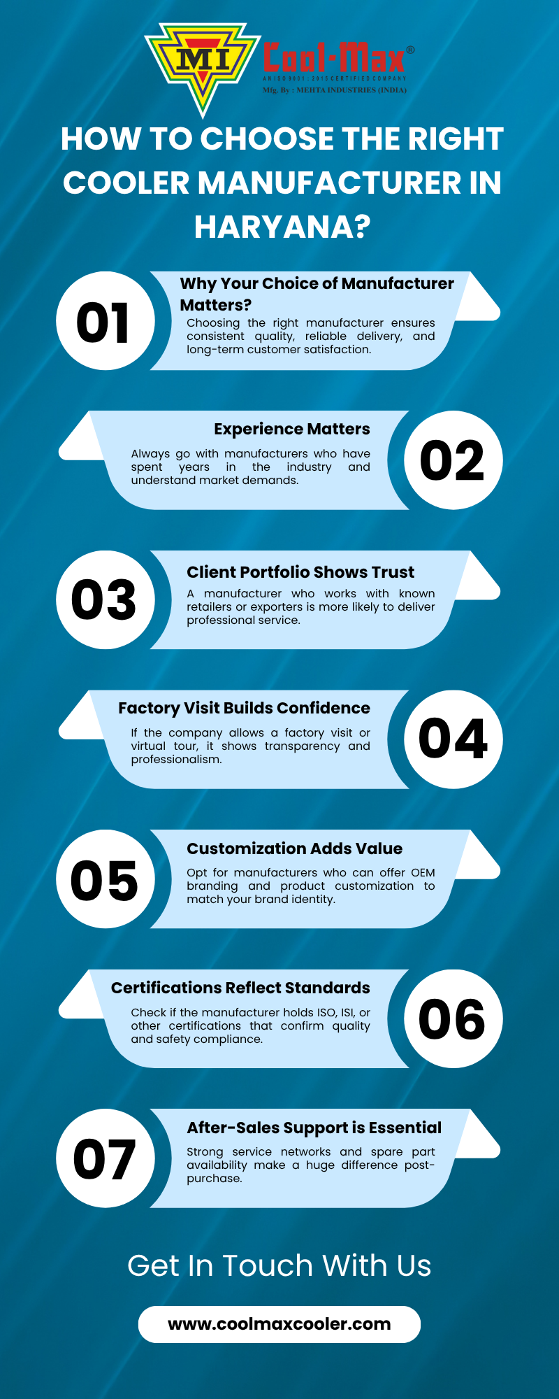 Looking for a reliable Air Cooler Manufacturer in Haryana? This infographic is your go-to guide for choosing the right supplier in the Haryana region. From checking certifications to understanding customization options, it covers all the essentials to help you make an informed decision. Midway through, you'll discover how Mehta Industries, a trusted Air Cooler Manufacturer in Haryana, stands out with quality, service, and bulk capabilities. Whether you're a retailer or a bulk buyer, this checklist ensures you don't miss any critical step. Explore the infographic now and connect with the best Air Cooler Manufacturer in Haryana today! Visit Us: https://www.coolmaxcooler.com/cooler-manufacturer-in-haryana Call: +91-7015883031 Mail: mehta_mi.industries@yahoo.com