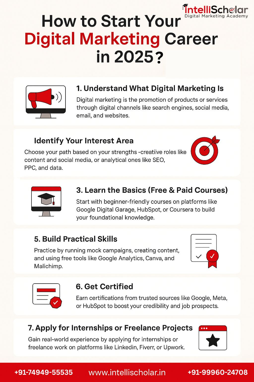 Kickstart your journey into the world of digital marketing with our beginner-friendly infographic, “How to Start Your Digital Marketing Career in 2025?.” This visual guide breaks down each step — from learning the basics and identifying your niche to getting certified and finding real-world opportunities. Whether you're a student, job seeker, or entrepreneur, this is the perfect starting point to build your online marketing skills. For those looking for a deeper learning experience, Digital marketing courses in Ambala are provided by IntelliScholar, offering comprehensive training with hands-on projects, expert mentorship, and industry-recognized certifications to shape your professional future. IntelliScholar is a trusted name in career-focused education, empowering learners with real-world digital skills. Visit Us: https://www.intellischolar.in/digital-marketing/ Call: +91-7494955535, +91-9996024708 Mail: info@intellischolar.in